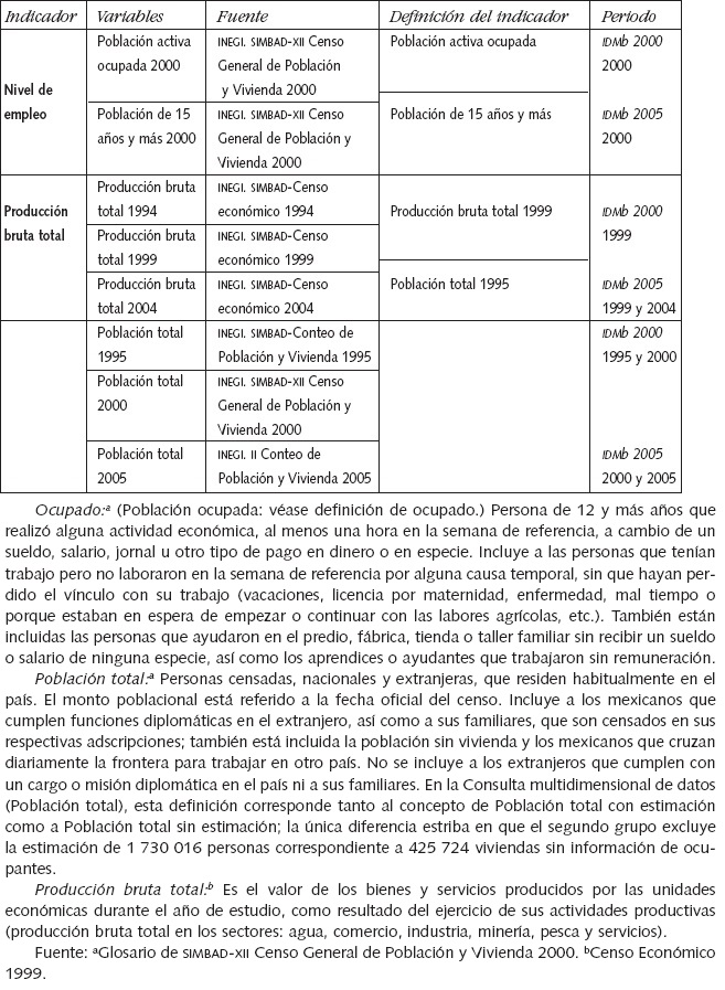 La información para construir los indicadores se obtuvo de simbad-INEGI (censos económicos de 1994, 1999 y 2004, así como del censo poblacional de 2000 y los conteos de población de 1995 y 2005).