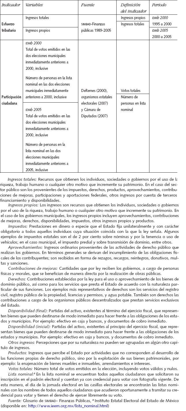 La información para construir los indicadores se obtuvo de simbad-INEGI (finanzas públicas municipales 1989-2005), organismos estatales electorales, Cámara de Diputados federal, Centro de Investigación para el Desarrollo A.C. (CIDAC) y De Remes (2000).