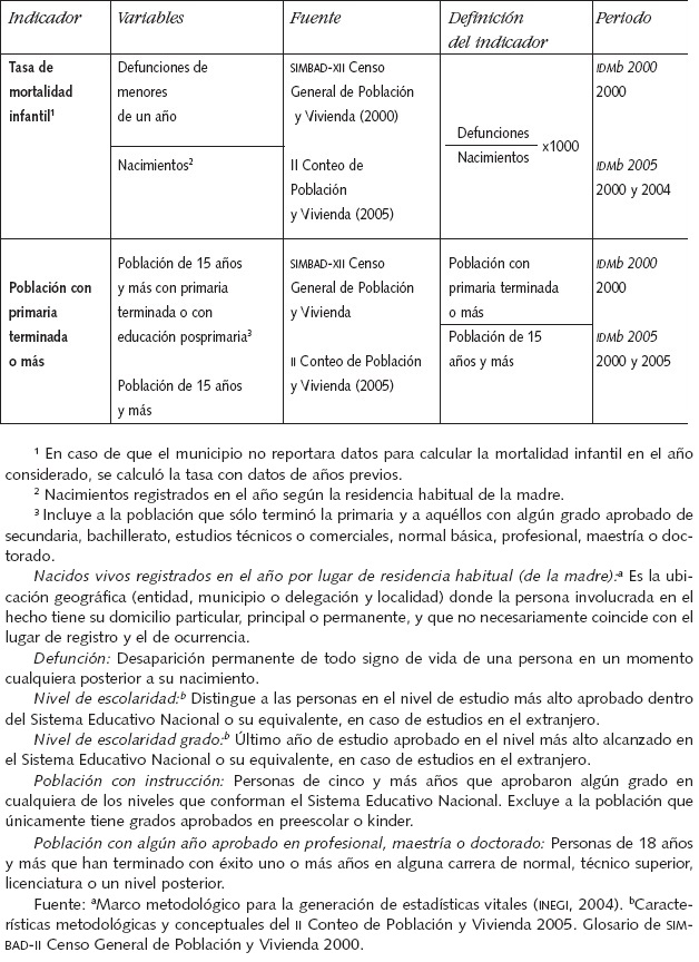 En la construcción de la base de datos que alimenta al IDMb se prefirió emplear fuentes institucionales de acceso libre para maximizar la calidad de la información que alimenta el índice y facilitar su cálculo en años posteriores. Toda la información que se emplea para calcular el IDMb proviene de diversos estudios del Instituto Nacional de Estadística, Geografía e Informática (INEGI),29 con excepción de las variables electorales (votos totales y número de personas registradas en la lista nominal de electores en elecciones municipales) que obtuvimos de tres fuentes: De Remes (2000), organismos estatales electorales y el Centro de Estudios Sociales y de Opinión Pública (CESOP) de la Cámara de Diputados Federal.30