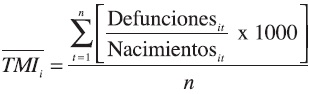 n es el número de observaciones disponibles en el periodo considerado, en el caso del indicador de mortalidad infantil n=1 para IDMb 2000 y n=2 para el IDMb 2005, pues el promedio considera sólo una observación (2000) en el primer caso y dos (2000 y 2004) en el segundo. En los casos en que un municipio no reporta información de uno de los periodos, el indicador sólo incluye el periodo del que existe información. En casos donde el municipio a no reporta información para calcular la tasa de mortalidad infantil para ningún periodo, el indicador que se utilizó para calcular el IDMb corresponde a la tasa de mortalidad infantil promedio en el estado del municipio a.