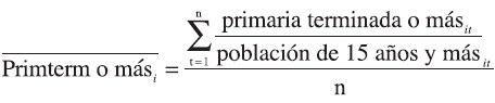 n es el número de observaciones disponibles en el periodo considerado, en el caso del indicador de primaria terminada o más n=1 para IDMb 2000 y n=2 para el IDMb 2005, pues el promedio considera sólo una observación (2000) en el primer caso y dos (2000 y 2005) en el segundo.