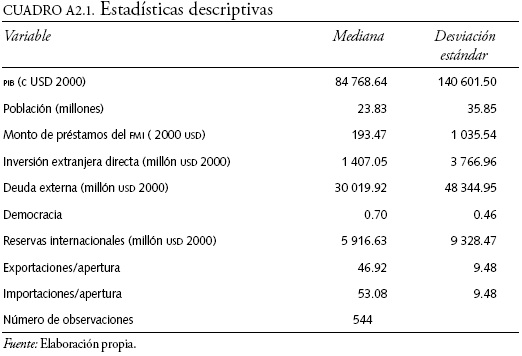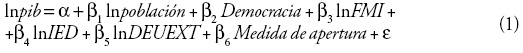 Donde lnpib es el logaritmo del producto interno bruto; lnpob el logaritmo del número de habitantes en cada país; democracia es la variable dummy mencionada (un valor de 1 representa un entorno democrático y 0 corresponde a un entorno no democrático); lnFMI es el logaritmo del monto de los préstamos otorgados por el fondo Monetario Internacional; lnIED es el logaritmo de inversión extranjera directa; lnDEUEXT es el logaritmo de la deuda externa pública y, por último, la medida de apertura se construye como el cociente entre las exportaciones e importaciones respecto de la balanza comercial total.13 En el caso de las variables que se expresan en logaritmos, los coeficientes representan la elasticidad de cada variable independiente en relación con la dependiente. En el caso del intercambio comercial (que no se expresa como logaritmo), su coeficiente muestra el efecto marginal de estas variables sobre el crecimiento. La estadística descriptiva de nuestras variables se presenta en el cuadro A2.1