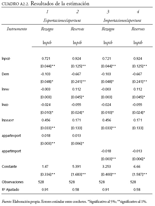 Las variables instrumentales elegidas son las variables explicativas endógenas rezagadas un periodo (también se utilizaron los segundos rezagos de estas variables como instrumentos, no obstante los resultados no varían). La elección de este instrumento obedece a que consideramos que existe correlación temporal débil entre la variable dependiente y los rezagos de los estimadores. Siguiendo a Barro y Lee (2002), instrumentamos la variable IMF a través del monto de las reservas internacionales (en logaritmos) de los 16 países seleccionados, pues es uno de los determinantes más importantes del uso y monto de crédito proveniente de este organismo internacional. El cuadro A2.2 permite observar los resultados de la estimación en dos etapas.