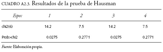 El cuadro A2.3 muestra los resultados para cada especificación (incluyendo el valor estadístico y su probabilidad). Como lo indica el cuadro, el uso de nuestros instrumentos mejora significativamente la estimación y la consistencia de los parámetros seleccionados.