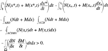 Este resultado se fundamenta mediante la aplicación del teorema de Green considerando que la región Ω delimitada por la curva ACDBA se encuentra acotada superiormente por la senda singular xs(t), y por lo tanto la condición (A1.9) es vigente.