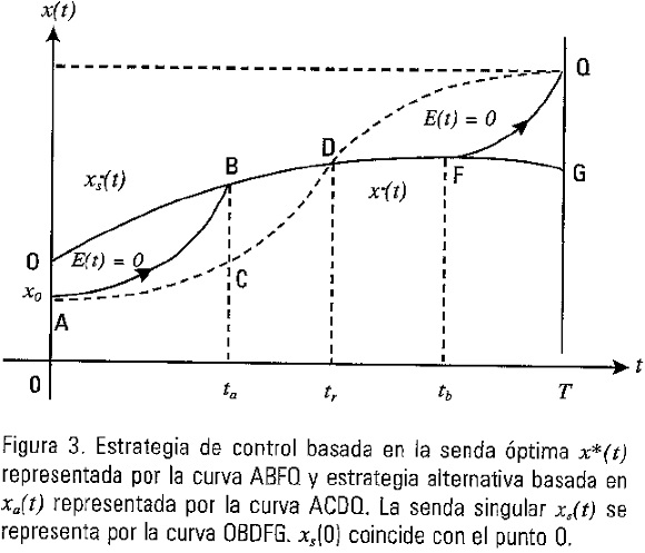 Estableceremos a continuación una corroboración directa de la optimalidad de la estrategia de control asociada con x*(t). Sin pérdida de generalidad abordaremos el caso x0<xs(t0). Consideremos la trayectoria x*(t) asociada con la estrategia de control óptimo ilustrada en la Figura 3 mediante la curva ABFQ y sigamos alternativamente la trayectoria xa(t) representada mediante la línea punteada ACDQ.