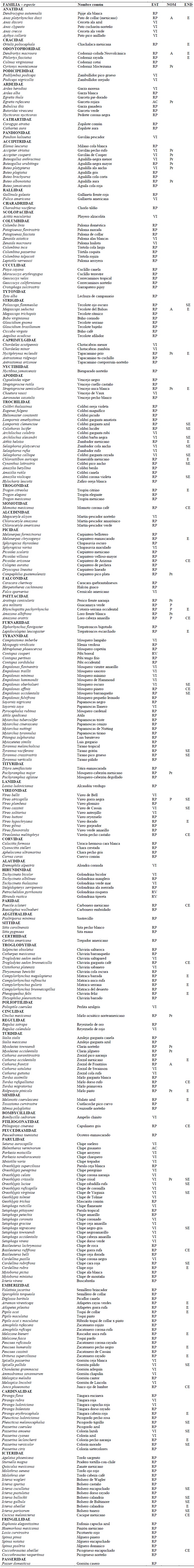 Lista de las especies de aves registradas entre 1899 y 2011 en la subcuenca del río Cupatitzio, Michoacán. Nombres comunes con base en Escalante et al. (1996); EST Estacionalidad: RP residente permanente, VI visitante invernal, VV visitante de verano, AC accidental; NOM Norma Oficial Mexicana NOM-059-SEMARNAT-2010: A amenazada, P en peligro de extinción, Pr bajo protección especial; END Niveles de endemismo: E endémica estricta de México, CE cuasiendémica, SE semiendémica.