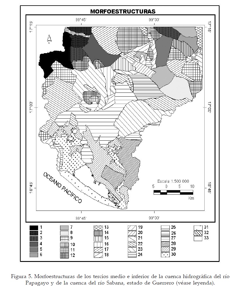 Leyenda de la Figura 5. Mapa morfoestructural de los tercios medio e inferior del río Papagayo y de la cuenca del río Sabana, estado de Guerrero, México (clasificación geomorfológica (tipológica) de la expresión estructuro-geológica en el relieve moderno del territorio).