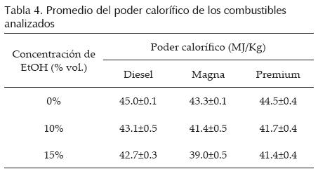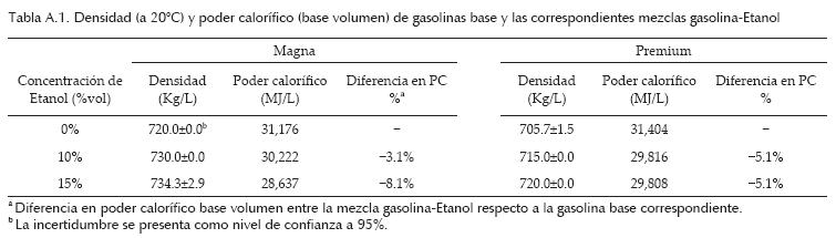 A las mezclas gasolina-Etanol se les determinó su densidad a partir del método ASTM D 218 (Castillo, 2008), los valores obtenidos se presentan en la tabla A.1. Así, es posible calcular el poder calorífico base volumen de cada uno de estos combustibles, de acuerdo a dichos valores de densidad y el poder calorífico reportado en la tabla 4 (tabla A.1). Considerando que la eficiencia energética es la misma empleando la gasolinas base y sus contrapartes de mezclas gasolina-Etanol, las diferencias porcentuales entre los valores del poder calorífico base volumen presentadas en la tabla A.1 representarían una aproximación a la diferencia del desempeño del rendimiento de combustible en términos de Km recorridos por litro de combustible quemado.