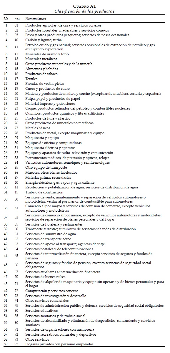 Al momento de realizar esta investigación, las SIOT y sus correspondientes niveles de empleo sectorial de la economía francesa (para 1995, 1997 y 1999 al 2005) se encontraban disponibles en el sitio web de Eurostat (<http://ec.europa.eu/eurostat>). Dado que podemos considerar que el cambio tecnológico a lo largo del tiempo más bien es "lento", optamos por aplicar nuestro análisis a los cuadros para 1995 y 2005. Así, los cuadros de insumo-producto describen 59 productos clasificados según la actividad (Classification of Product by Activity, CPA). En el A1 presentamos los productos de la economía francesa descritos y su correspondiente CPA. Sin embargo, dado que todos los elementos asociados con: 1) el producto 37 (materias primas secundarias) para ambos años y 2) el producto 12 (uranio y minerales de torio) para 2005 son igual a cero, los eliminamos de nuestro análisis. Por lo anterior derivamos los SIOT de dimensión 58X58 para 1995 y de 57x57 para el 2005.