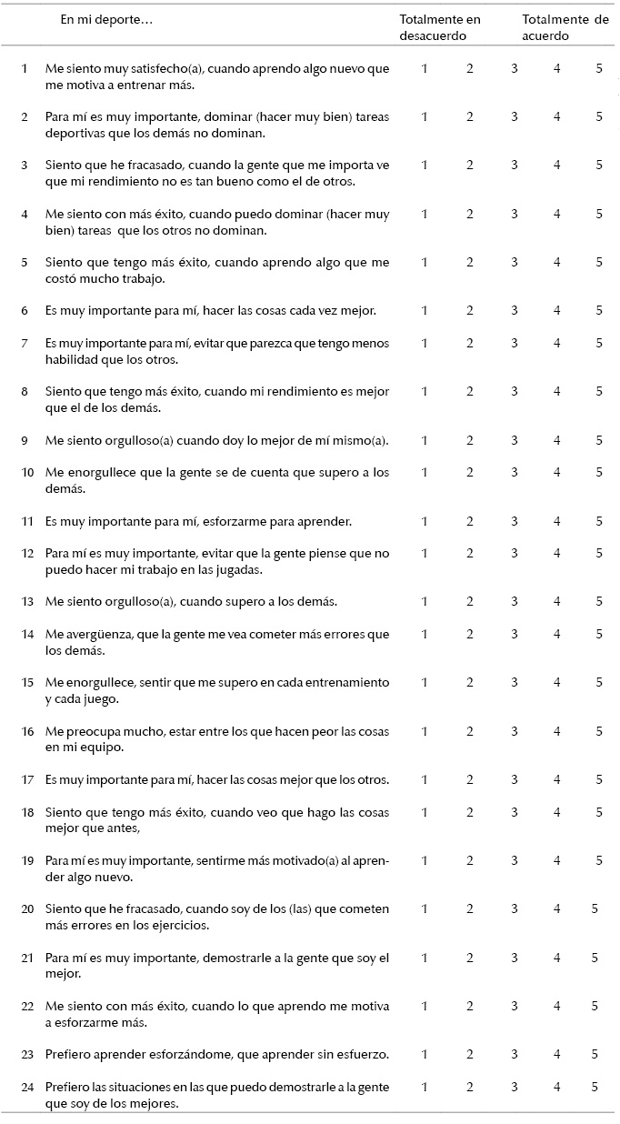 A continuación se presenta un conjunto de afirmaciones, seguidas de números del 1 al 5. Lo que tienes que hacer es leer esas afirmaciones y utilizar los números para describir lo que te sucede cuando practicas tu deporte. Para cada afirmación existen cinco respuestas posibles, que van de totalmente en desacuerdo (1) a totalmente de acuerdo (5). Tacha el número que refleja mejor lo que haces, piensas o sientes cuando practicas tu deporte. Por favor responde a todas las afirmaciones y tacha solo un número en cada una.