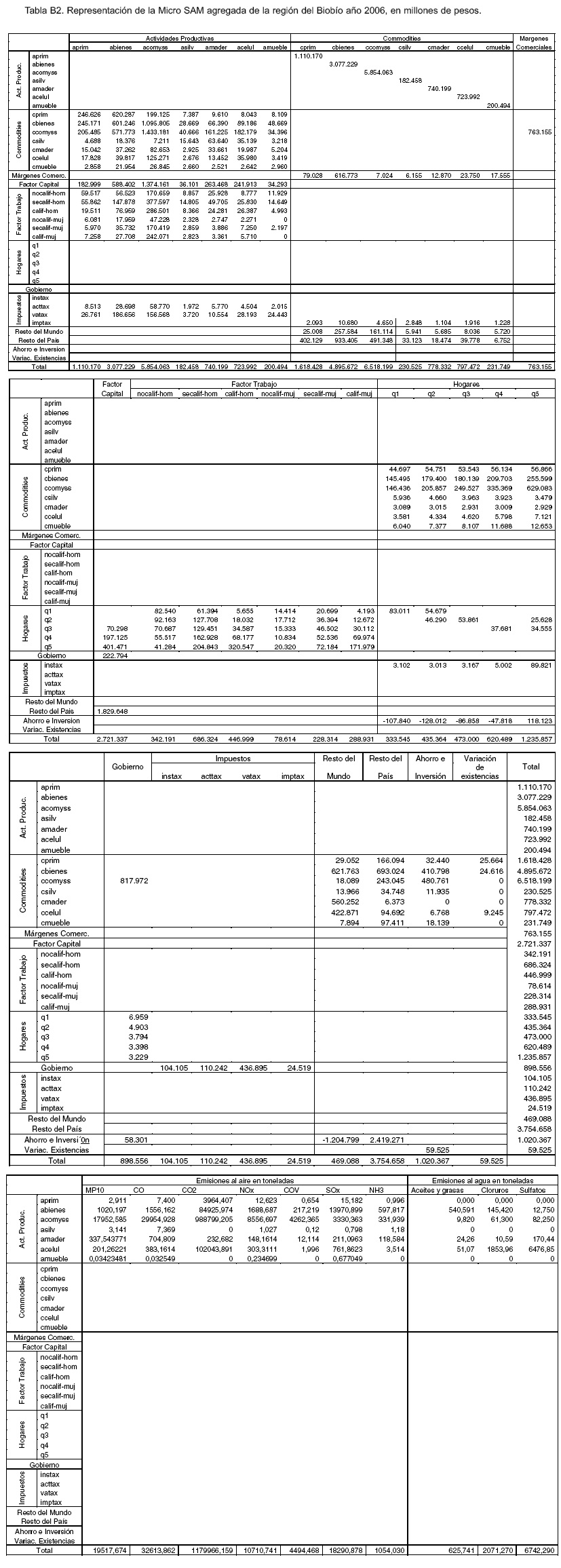 Otras cuentas de la SAM original que fueron desagregadas fue el sector de madera y muebles, electricidad-gas-agua, así como también el factor trabajo que se desagregó por género y nivel de calificación con base en la encuesta CASEN 2006.4