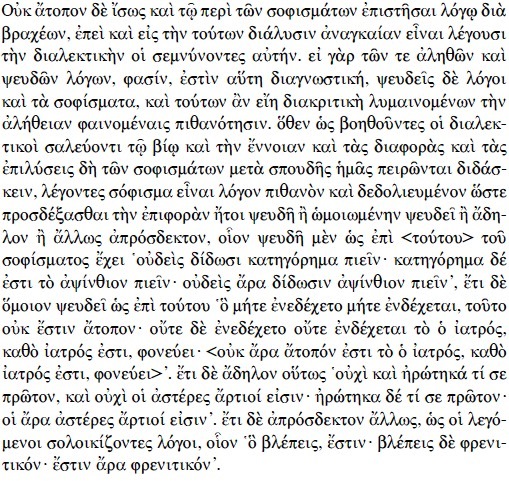 Con probabilidad no esté fuera de lugar enfocarnos brevemente en la teoría de los sofismas, pues quienes veneran la dialéctica misma dicen que también es necesaria para la solución de éstos. En efecto, afirman, si ésta es capaz de identificar argumentos verdaderos y falsos, y los sofismas también son argumentos falsos, también debe ser capaz de distinguirlos a ellos, que ultrajan la verdad por medio de su aparente verosimilitud. Por ello, los dialécticos, saliendo al rescate de nuestra vacilante vida, intentan con empeño enseñarnos la concepción de los sofismas, sus diferencias y sus soluciones, al decir que un sofisma es un argumento convincente, pero, un hecho engañoso, de tal modo que es aceptada su conclusión, que es falsa o igual a una falsa o no-evidente o de otra forma inaceptable. Por ejemplo, es falsa como en el caso de este sofisma: "nadie da a beber un predicado; pero beber ajenjo es un predicado; por lo tanto, nadie da a beber ajenjo". En cambio, [la conclusión] es igual a una falsa como en éste: "aquello que ni era ni es el caso, no es absurdo; pero ni era ni es el caso que el médico en cuanto médico cometa un asesinato; <por lo tanto, no es absurdo que el médico en cuanto médico cometa un asesinato>". Por otra parte, [la conclusión] es no manifiesta de este modo: "no ambas son el caso: te he hecho una primera pregunta y no es par el número de estrellas; pero te he hecho una primera pregunta: por lo tanto, el número de estrellas es par". Y [la conclusión] es de otra forma inaceptable como en los argumentos que enuncian solecismos, por ejemplo: "lo que ves existe; pero ves una alucinación; por lo tanto, la alucinación existe".