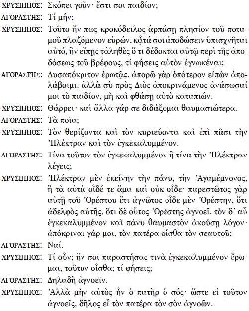 CRISIPO: Electra es aquella famosa, la de Agamenón, la cual conoce y al mismo tiempo no conoce las mismas cosas. En efecto, al ponerse Orestes junta a ella sin aún darse a conocer, ella conoce a Orestes, porque es su hermano, pero ignora que éste es Orestes. También escucharás "el Encapuchado", un argumento sumamente sorprendente. Respóndeme: ¿conoces a tu propio padre?