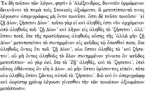 Comenzando a partir de estos argumentos, dice Alejandro [de Afrodisia], es posible mostrar que, en los estoicos, las proposiciones que algunos llaman "cambiantes de forma indeterminada" no son tales. Éstas son de este tipo: "Si Dión está vivo, Dión estará vivo", pues si bien esto es verdadero ahora (teniendo como antecedente la proposición verdadera "Dión está vivo" y como consecuente verdadero "estará vivo"), sin embargo, llegará un momento en que, siendo verdadera la premisa adicional "pero Dión está vivo", el condicional cambiará [de valor de verdad] a falso, en virtud de que llegará un momento en que, siendo todavía verdadera "Dión vive" [ya] no será verdadera "y estará vivo": al no ser ésta verdadera, el condicional en su conjunto, al ser cambiante, se volvería falso. En efecto, no siempre [es verdadera] "estará vivo" cuando "está vivo" es verdadera, pues de ese modo Dión sería inmortal. Pero, por cierto, no será posible decir definidamente cuándo, al estar vivo él, no será verdadera "estará vivo". Por ello, dicen que el cambio [de valor de verdad] de tales proposiciones ocurre en un tiempo indefinido e indeterminado.