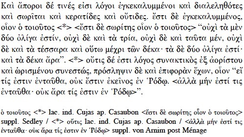 También hay algunos argumentos aporéticos: "los encapuchados", "los ocultos", "los montones", "los cornudos" y "los no-alguien". "El encapuchado" es como éste <*>. <"El montón" es como éste:> no es el caso que "dos" sean pocos, pero que "tres" no lo sean, ni que éstos [lo sean] pero "cuatro" no lo sean, y así hasta llegar a "diez". Sin embargo, dos son pocos, por consiguiente también lo son "diez". <*> "El no-alguien" es un argumento concluyente que, al tener una premisa adicional y una conclusión, está formado por una proposición indefinida y una definida [como primera premisa], por ejemplo, "si hay una persona aquí, ésta no está en Rodas. <Pero hay una persona aquí; por consiguiente, no hay una persona en Rodas.>