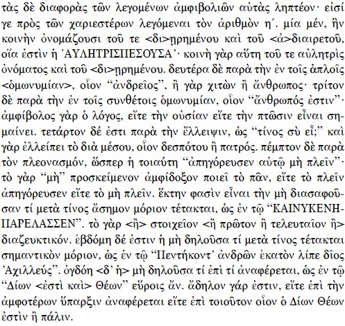 Una ambigüedad es una expresión que, lingüística y estrictamente, significa dos o incluso más estados de cosas y de acuerdo con el mismo uso, de manera que, conforme a esa expresión, se admiten simultáneamente los múltiples [significados]. Por ejemplo, auletris peptoke pues por sí misma [esta expresión en griego] revela lo siguiente: "una casa tres veces se ha caído" o "Una flautista se ha caído".