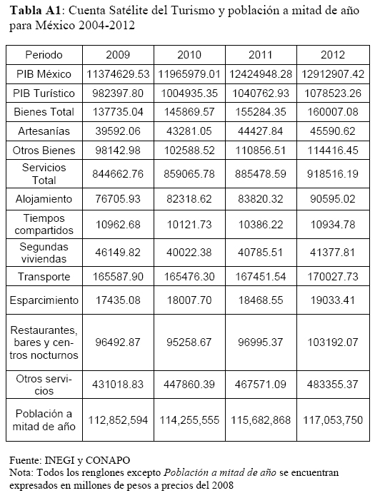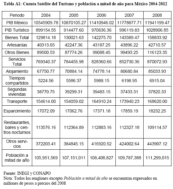 El presente apéndice tiene como objetivo presentar los datos de la Cuenta Sátelite de Turismo y del número de habitantes a mitad de año de la población mexicana. Los datos fueron obtenidos a través del Instituto Nacional de Estadística y Geografía (INEGI) y del Consejo Nacional de Población (CONAPO) respectivamente.