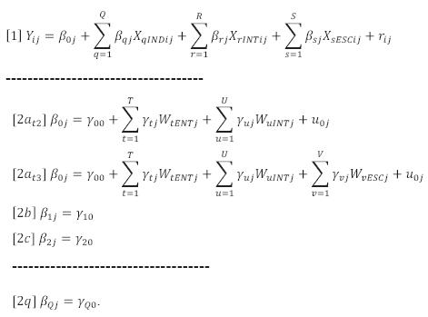 Los sub-modelos βqj = γq 0 indican que las pendientes de los factores individuales sobre los aprendizajes en cada escuela se establecieron como fijos (promedios ponderados a nivel nacional), sin dejarse variar libremente entre escuelas y obviamente, sin modelarse estas variaciones.