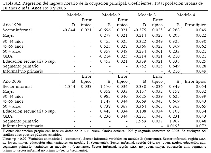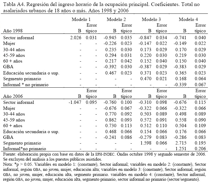 donde J representa a la pertenencia al segmento primario. Finalmente, en un cuarto modelo incluimos la interacción entre la pertenencia al sector informal y al segmento precario/marginal del mercado de trabajo. En esta última ecuación, los efectos remanentes del componente G indican puestos estable dentro del sector informal.