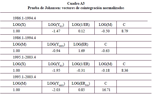 No fue posible construir modelos var adecuados para el periodo en su conjunto, pero el análisis econométrico nos condujo a una estimación distinguiendo los años 1986-1994 y 1995-2003. Esa estrategia ya fue seguida por otros autores y tiene completo sentido macroeconómico (entre otros Guerrero 2006a y 2006b). Cabe señalar que exploramos distintas especificaciones de las ecuaciones correspondientes a las exportaciones e importaciones, y en el Cuadro A3 reportamos las formas seleccionadas según los criterios estadísticos comentados anteriormente.
