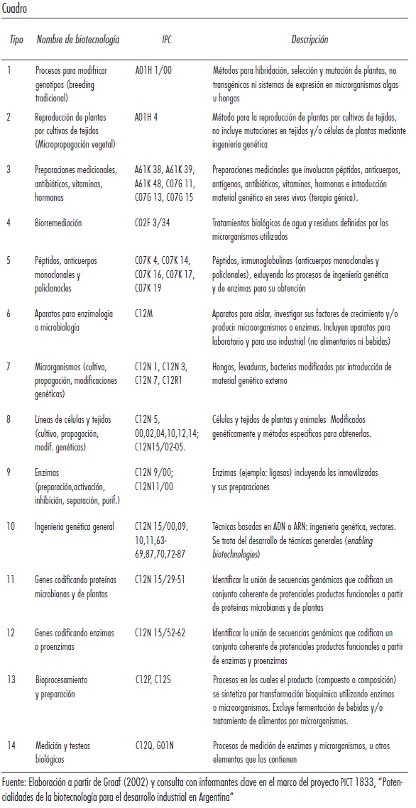 La definición de la OCDE abarca una amplia variedad de CIP biotecnológicas, que van desde técnicas de ADN recombinantes hasta técnicas tradicionales de biorremediación. Agrupamos las clasificaciones según distintas áreas biotecnológicas a partir de la clasificación realizada por Graff (2002) y de la consulta con investigadores en ciencias biológicas. Se determinaron 14 campos o áreas de conocimientos biotecnológicos.