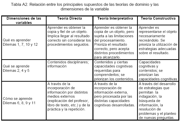 Tabla A2. Relación entre los principales supuestos de las teorías de dominio y las dimensiones de la variable