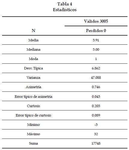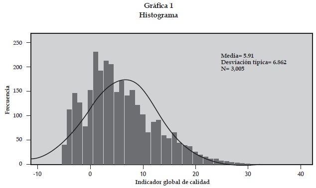 Se tienen 3 005 IES, el índice de calidad global varía de -5 a 32. La media es de 5.91 y la mediana de 5.00. La asimetría es de 0.746, que representa una asimetría positiva; esto quiere decir que los datos tienden hacia valores menores que la media. Los datos se agrupan bien alrededor de la media y se tiene una curtosis de 0.205.