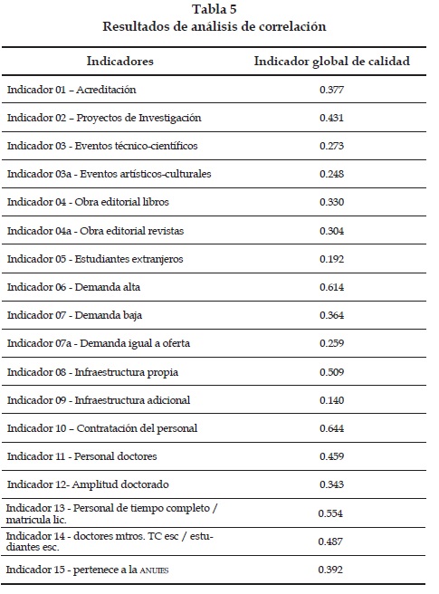 La correlación observada de cada indicador con el indicador de calidad global es significativa y positiva. Los indicadores más correlacionados con el índice global son Indicador 10 - Contratación del personal, Indicador 06 - Demanda alta, Indicador 13 - Personal de tiempo completo / matrícula Lic. Por otra parte los menos correlacionados son Indicador 03 a - Eventos artísticos/culturales, Indicador 05 - Estudiantes extranjeros, Indicador 09 - Infraestructura adicional.
