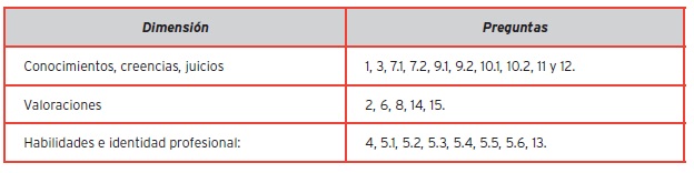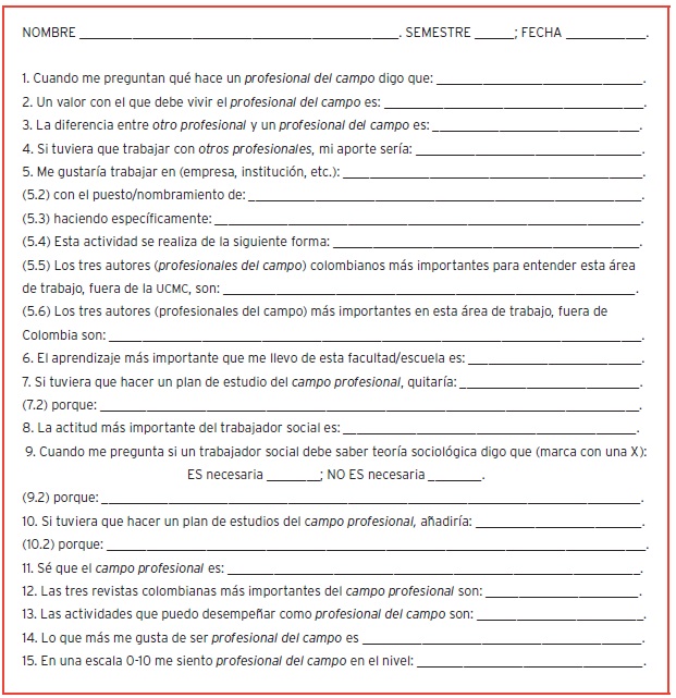 Se aplicó el mismo cuestionario a ambos grupos, sólo especificando el campo respectivo en las preguntas correspondientes (aquí se sustituye por las expresiones: profesional del campo, campo profesional y otros profesionales).