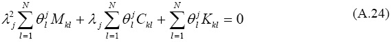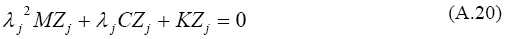 donde M es la matriz de masa, C la de amortiguamiento, y K la de rigidez. El vector y(t) provee los desplazamientos relativos. Se busca una solución armónica de la forma y(t)=Z exp[λt], donde Z es un modo complejo, y λ es una frecuencia natural compleja del sistema. La substitución de y(t) en la ecuación A-19 para el javo modo, resulta en:
