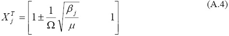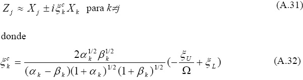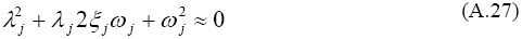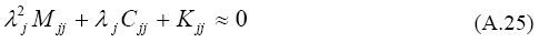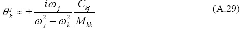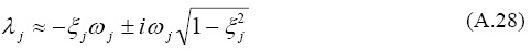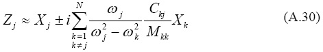 Puesto que el lado derecho de la ecuación A-28 provee las frecuencias complejas exactas, se verifica entonces que la ecuación A.26 constituye una buena selección para expresar el amortiguamiento modal ya que conduce a una aproximación de primer orden de los valores exactos de las frecuencias. Para el caso en que k≠j en A.24, y reteniendo solamente los términos de primer orden, tenemos: