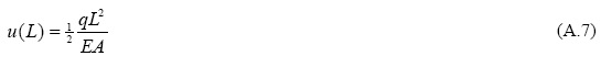 La Ec. A.7 permite valuar la elongación en el extremo de la barra soldada. Si reemplazamos la Ec. A.1 en A.7 se obtiene la Ec A.8, la que muestra que la elongación u(L) se valúa en términos de la fuerza actuante T y de la longitud L/2. Esto permite definir para la barra soldada de longitud L una longitud equivalente en una barra sin soldar con un extremo fijo igual a L/2. La Figura A4 muestra de manera gráfica la equivalencia entre una barra soldada, con carga distribuida q en un longitud L, con otra sin soldar de longitud L/2 con extremo fijo, en la que actúa T, y sin carga q.