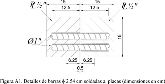 En este Apéndice se valúa la longitud efectiva, Le, de una barra ϕ 2.54 cm soldada a una placa de 1/2" de espesor, Fig A1. La longitud total de cada barra es 25.5cm, en la que 12.5 cm corresponde a la longitud soldada en cada placa, y la separación entre placas es de de 0.5cm, Fig A1.
