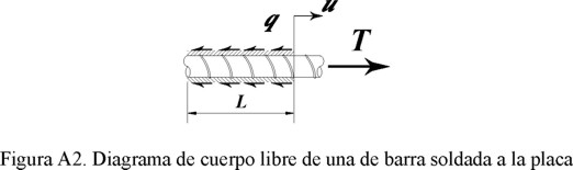 La Fig A2 muestra el diagrama de cuerpo libre de una de las barras, soldada en una longitud L a una placa, en la que se aplica una fuerza de tracción T, y donde actúa la fuerza distribuida de cortante q constante. Del equilibrio se obtiene: