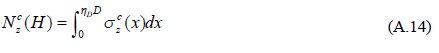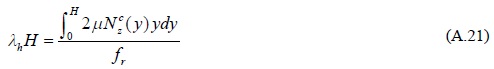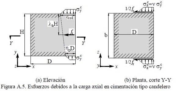 La figura A.5 muestra la distribución de esfuerzos inducidos por las fuerzas en la columna, en el segmento de columna introducida a una profundidad H, dentro de la cimentación tipo candelero. El parámetro σcy es el esfuerzo de compresión en la dirección vertical ver figura A.5a. Dicho esfuerzo induce esfuerzos transversales a la sección de la columna denotado por σcz, que a su vez producen las fuerzas de fricción, ½fr, en cada cara de la interfase columna y cimentación, ver figura A.5b. A continuación se calcula la fuerza de fricción en función de las dimensiones del segmento de columna, el módulo de Poisson denotado por v y el coeficiente de fricción, μ, y características de los materiales.
