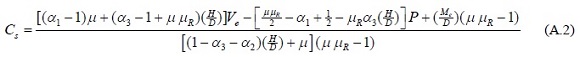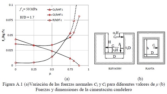 La figura A.3 muestra la relación entre las correspondientes fuerzas de la cimentación sin presfuerzo y con presfuerzo, para las fuerzas en el borde superior, Cs/Csp, las fuerzas en el fondo de la cimentación, Ctp/Ct. Los resultados calculados indican que para valores de μ menores que 0.75, las fuerzas, en ambos tipos cimentación, son prácticamente iguales y difieren en valores menores que 2%.