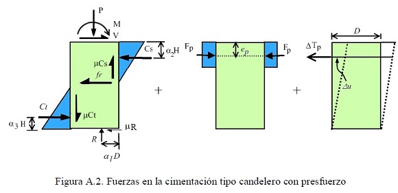Para la cimentación candelero con presfuerzo, ver figura A.2, las ecuaciones obtenidas con base en el equilibrio están dada por el sistema ecuaciones A.5, las cuales son una generalización de la ecuación A. 1.