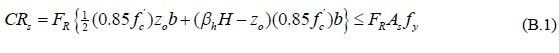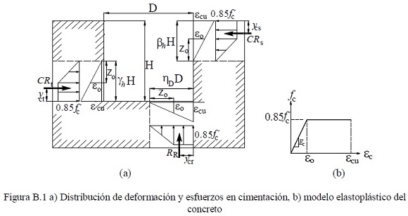 La resistencia a compresión en el borde superior de la cimentación tipo candelero sin presfuerzo, es la resultante de una distribución elastoplástica el concreto en dicha zona y está limitada por la resistencia en tracción del acero de refuerzo que equilibra la fuerza en compresión, CRs, la que a partir de la integración del volumen de esfuerzos mostrados en la figura B.1a se puede expresar mediante:
