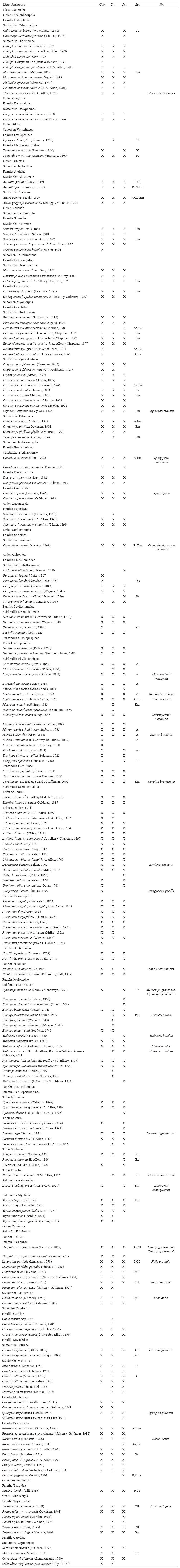 Lista sistemática de los mamíferos terrestres de la península de Yucatán. La secuencia filogenética de los órdenes, subórdenes, familias, subfamilias y tribus es con base en Wilson y Reeder (2005). Las especies y subespecies se listan alfabéticamente; estas últimas siguiendo a Ramírez-Pulido et al. (2005). Las abreviaturas en las columnas significan: Cam= Campeche, Yuc= Yucatán, Qro= Quintana Roo, Ren= riesgo y endemismo, Sim= se indican los principales nombres científicos con los cuales históricamente han sido nombradas algunas especies (incluye sinónimos y los cambios de nomenclatura y taxonómicos). El grado de endemismo es el establecido en la Nom-059-Semarnat-2010 (E= especie endémica y Ee= subespecie endémica) y el propuesto por Ceballos et al. (2005): Em= endémica de Mesoamérica y Ex= endémica de México. Las categorías de riesgo son las estipuladas en la normativa mexicana (Semarnat, 2010) (Pr= especies sujetas a protección especial, Prs= subespecies sujetas a protección especial, A= especie amenazada, Aa= subespecie amenazada, P= especie en peligro de extinción, Pp= subespecie en peligro de extinción) y en la Convención sobre el comercio internacional de especies amenazadas de fauna y flora silvestres (Cites, 2012) (CI= Apéndice I, CII= Apéndice II).