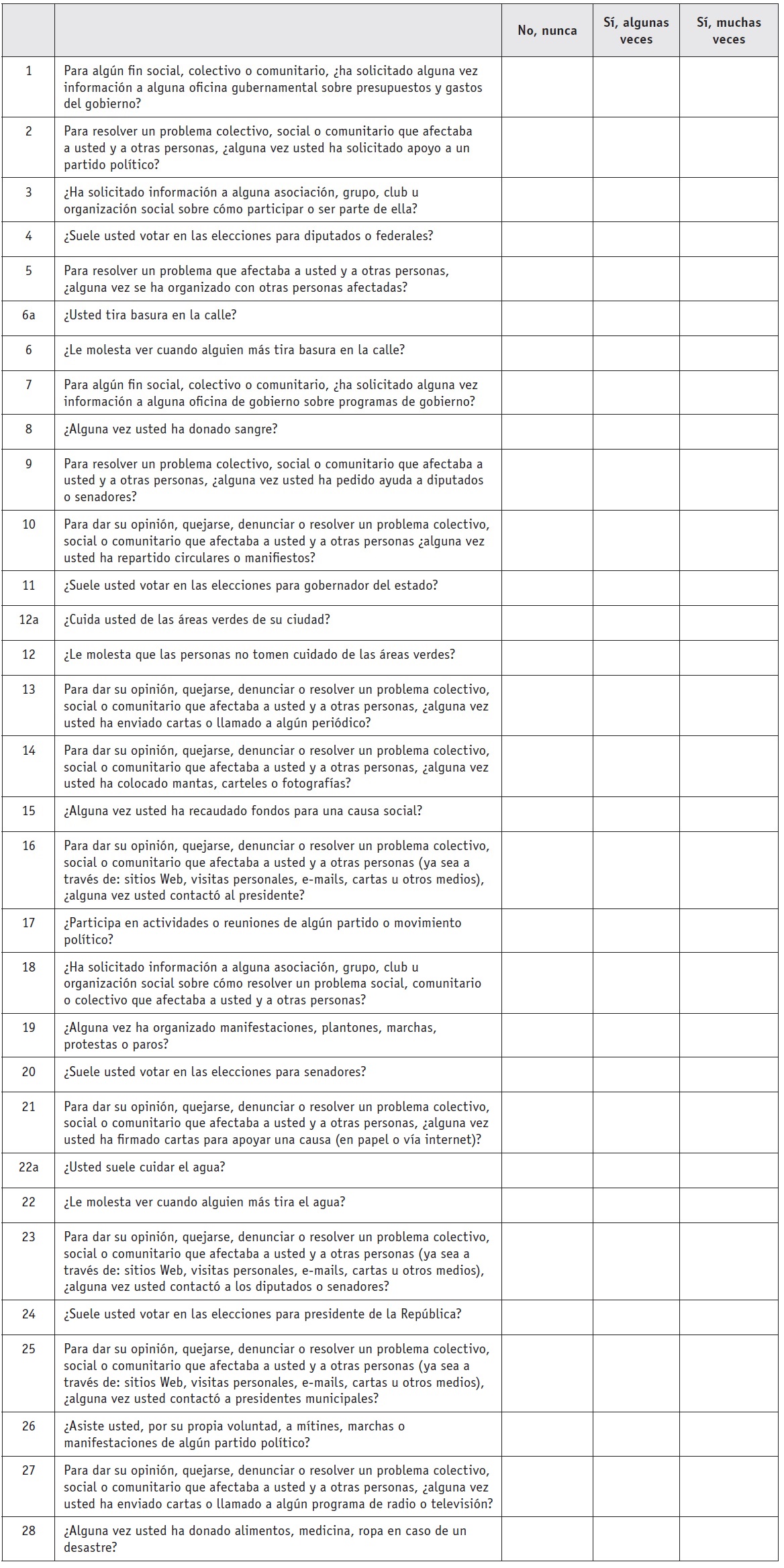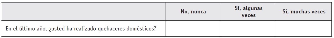 Así, la respuesta "nunca" se refiere a que usted no realiza esa actividad, ni la ha realizado en el pasado; "algunas veces" se refiere que sí la realiza o la ha realizado, pero no muy seguido; y por último, "muchas veces" se refiere a que esta actividad se realiza o se ha realizado con regularidad.