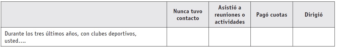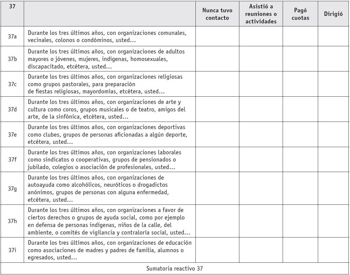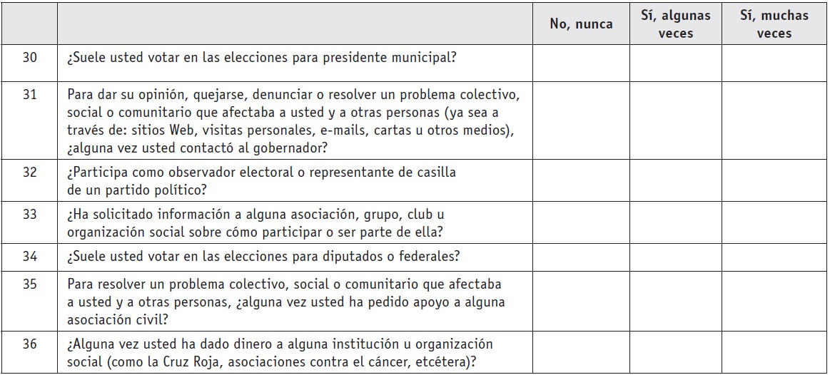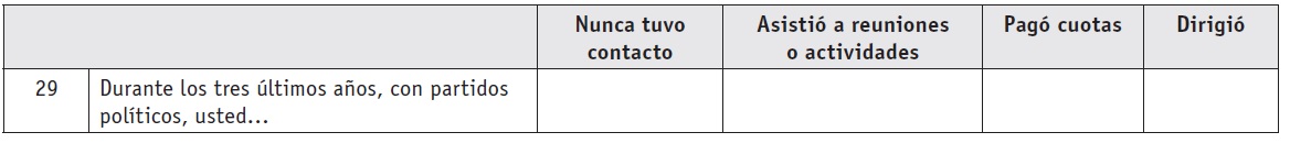 Así, la respuesta "nunca tuvo contacto" se refiere a que en los últimos tres años usted no tuvo ningún tipo de acercamiento al tipo de asociación que se menciona en el reactivo correspondiente; "asistió a reuniones o actividades" se refiere a que durante los último tres años sí tuvo acercamientos al tipo de asociación que se menciona en ese reactivo; "pagó cuotas" se refiere a que no sólo tuvo contacto o asistió a reuniones, sino que además pagó las cuotas que lo hacen miembro activo de la asociación en cuestión; por último, "dirigió" se refiere a que durante los últimos tres años lideró o encabezó alguna asociación del tipo que se menciona en dicho reactivo.