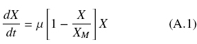 It is assumed that a mycelial fungus grows over a solid surface with area, A, producing quantity, X (grams in dry basis) according to the logistic equation, as follows