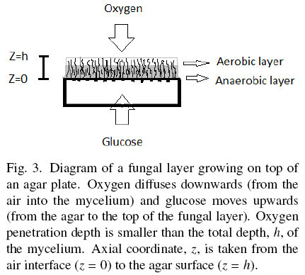 Hence, comparing eqs. (A10) and (A11), the following identification is obtained, ε = ρVhMAX. Therefore, the parameter ε is the maximal amount of biomass per unit area. For example, a mutant strain that is diverting most of the substrate to collateral products will be less productive than a wild type that has evolved to be highly productive with little diversion of the substrate in collateral products. Also, a column of packed bed particles could have more hindrance for the growth of the fungal layer than an open surface of a Petri dish. This is analyzed in the Discussion.