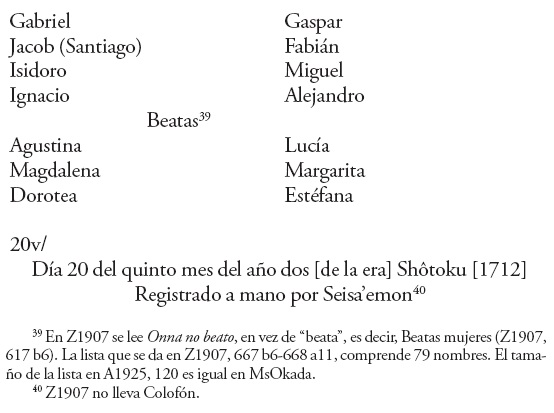 38 En Z1907 se lee Otoko no beato, es decir, Beatos varones (Z1907, 616 a7; A1925, 130). La lista que se da en Z1907, 666 a6– 667 b5, comprende 184 nombres (algunos de ellos repetidos). El tamaño de la lista en A1925, 120 es igual en MsOkada.