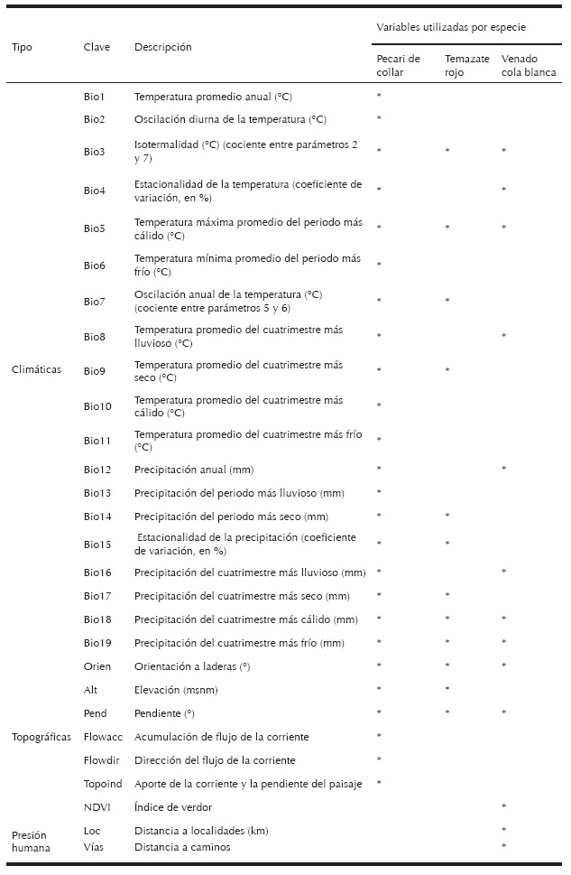Variables ambientales empleadas para generar los modelos de distribución potencial de las especies.