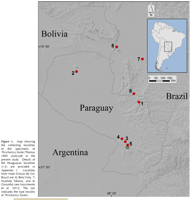 Paraguayan specimens of Thrichomys fosteri analyzed in this study. Localities are mapped in Figure 1. Voucher specimens are housed at the following collections: University of Michigan Museum of Zoology (UMMZ), Ann Arbor, USA and Colección de Mamíferos, Universidad Austral de Chile (UACH), Valdivia, Chile. Specimens used in the morphometric analysis are indicated by anm and those used in the genetic analysis are signalled by an*.