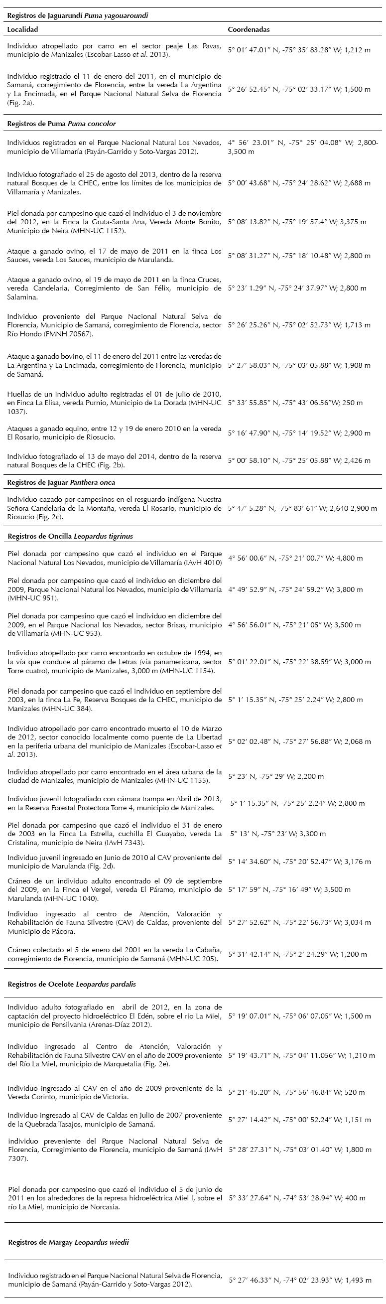 Localidades donde se tienen registros de felinos silvestres en el departamento de Caldas, Cordillera Central de Colombia.
