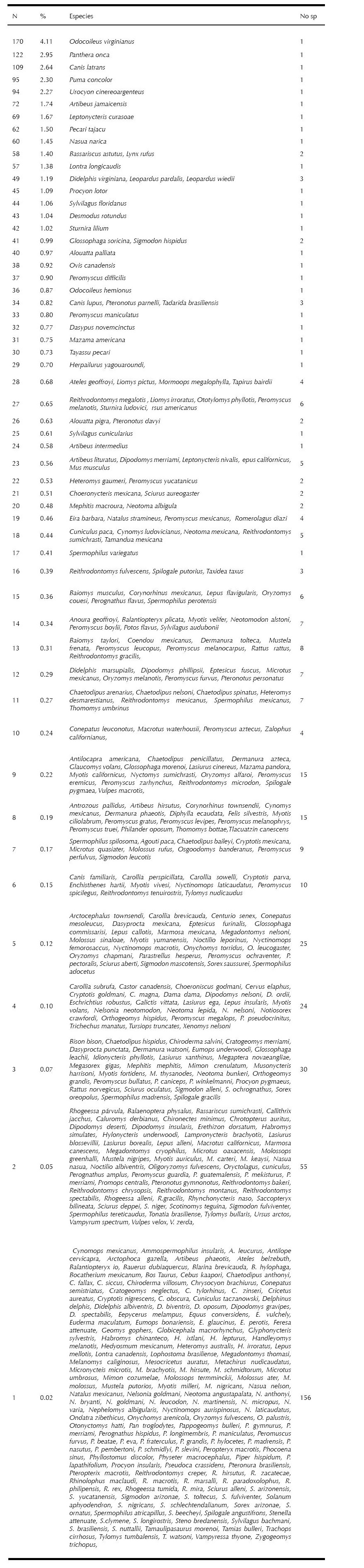 Lista de especies citadas en los trabajos presentado en los 11 Congresos Nacionales de Mastozoología organizados por la AMMAC (1991-2012). N =Número de trabajos presentados donde aparece(n) la(s) especie(s). Nota: Los nombres científicos se anotan tal cual los autores los mencionan en sus trabajos.