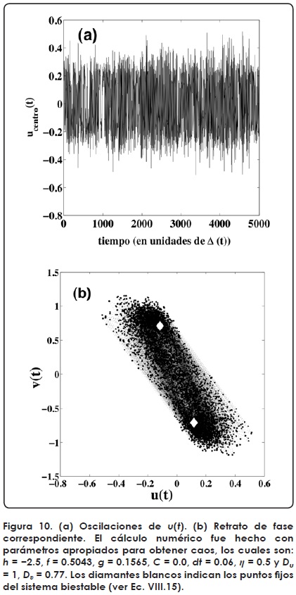 lo cual implica que una condición necesaria para que se presente caos es que los coeficientes de difusión de los dos morfógenos sean distintos, de acuerdo a (VIII.28). En la Fig.10 mostramos el resultado de un cálculo numérico en el que se presenta caos.